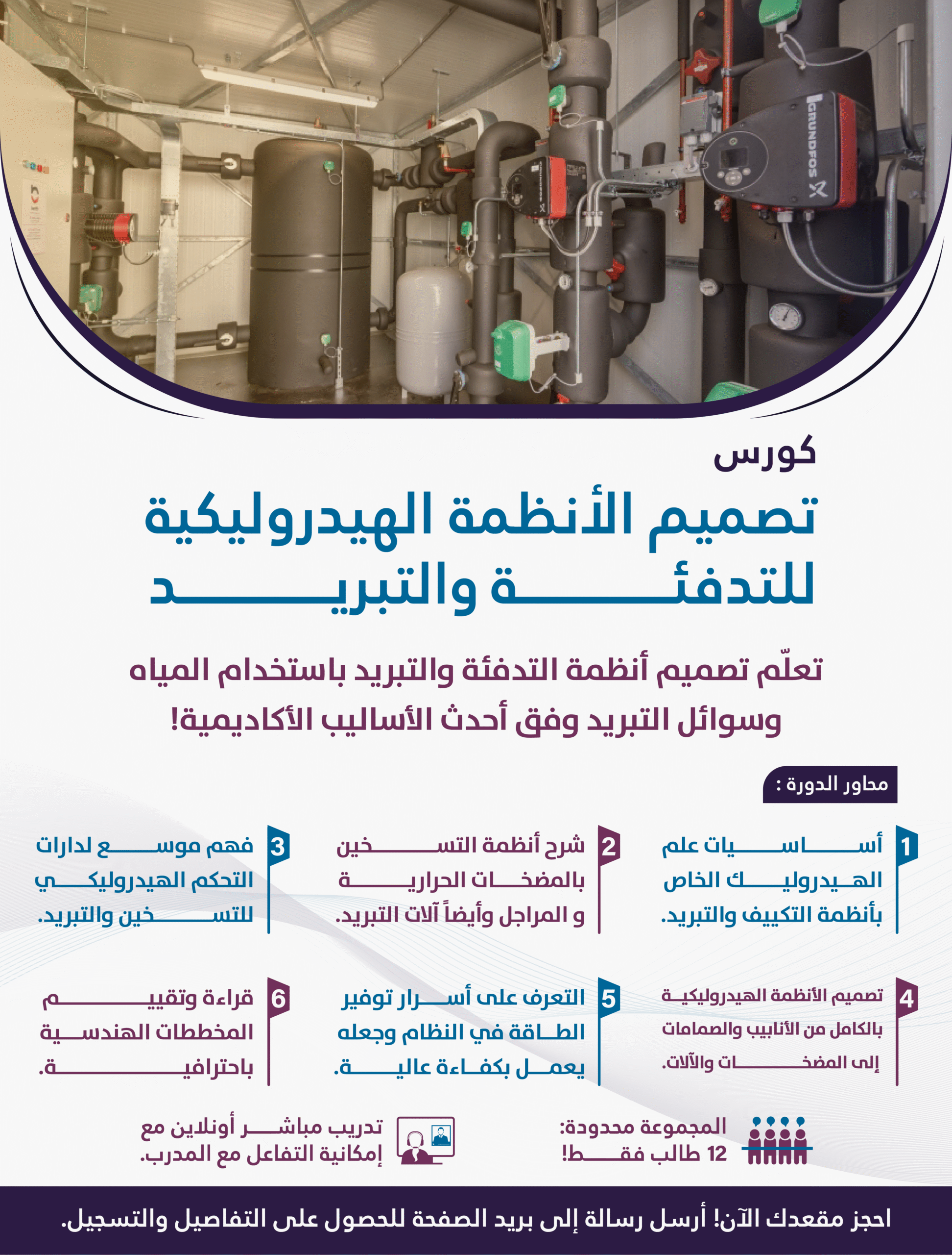 في كورس التصميم الهيدروليكي لأنظمة التكييق والتبريد نتعلم تصميم نظام التكييف والتبريد من وجهة نظر وسيط التبريد (الماء) الذي ينقل الطاقة الحرارية من الشيلر أو البيولر أو المضخة الحرارية إلى المشعات أو المبادلات الحرارية في منطقة الاستخدام.